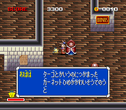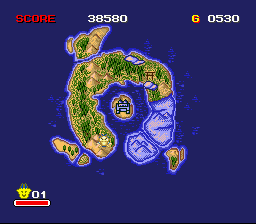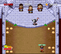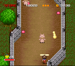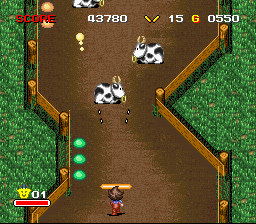 OK, so I admit, I haven't really spent much effort trying to read the Japanese text in this game, but apparently Tom crash lands from space in Zig Zag Land or something, and those three buffoons act as your nemesis in the game. I'm sure you won't be able to murder these three doorknobs, but you do get to kill bugs, pigs, cows, and other stuff that gets in your way. You have a cat (a Zig Zag Cat, apparently) that morphs into your ball. The B button accelerates your speed if necessary, while the A button throws your paddle ball forward. I like this feature, and it kind of reminds me of those paddle games on the Atari 2600 like Olympics or something. The right shoulder button activates your special items, such as when you collect the gun powerup.